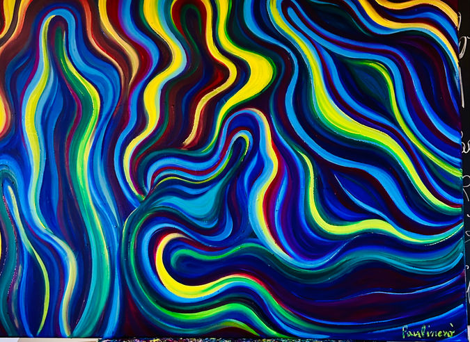 colori diretti non mescolati che mantengono intatta la loro forza, e forme liberate dal vincolo figurativo, trasformate in simboli ed energia che diventando veicolo di emozioni e di un linguaggio che non descrive mai evoca.